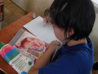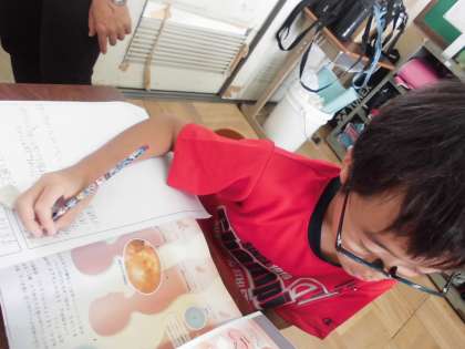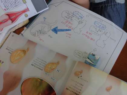 理科では「人のたんじょう」について学習を進めています。今日は,自分たちが疑問に思ったことを教科書や資料を使って解決し,まとめていくことを行いました。子どもたちは,しばらく「何にしよ〜?」と悩んでいましたが,時間が経つにつれ,「息はどうしてるんかな?」「どんなふうに胎児は大きくなっていくんやろ?」と,調べることを決め,黙々と書きまとめていました。次の時間は,コンピュータも使って調べる予定です。生命の神秘を感じるとともに,生命の大切さを考えてほしいです。