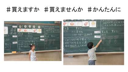 算数の「買えますか買えませんか」の様子です。少しずつみんなの前で説明することに慣れてきたようです。なかには,指で示しながら発表する子もいます。