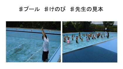 水泳学習もいよいよ終盤です。今回は「きれいな浮く」から「泳ぐ」につなぐ大事な場面でした。けのびに挑戦しました。みんな最初は,頭があがっていたり上からバチャンともぐってしまったりしていたのですが,最後にはスーっとうまくできるようになりました。それも先生のモデルのおかげでした。