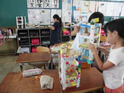 図工「コロコロガーレ」のコースが完成し,柱を組み立て始めました。できあがった子はコースにビー玉を転がして改良点を見つけています。友達どうしでも遊んで楽しんでいる様子が見られます。今週中にみんなが完成して,お互いに見せ合うことができればいいと考えています。