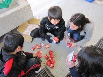 給食週間最終日(1月28日)に,牛乳パックつめ競争をしました。自分たちが飲んだ後の牛乳パックを片付けるときにいつも折りたたんでいます。この日は一つの牛乳パックにいくつ入れられるかを競いました。いつもきれいに折りたたんで片付けるようと考えてこの取組をしました。