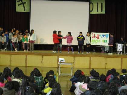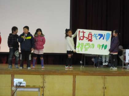 2月1日 2年生は自分たちの取り組んでいる「発見!キラリ福西の町」について,「福西の知られざるすてきをわたしたち2年生がついに発見したのです。『すばらしい景色』『すてきな遊び場』『福西のむかし』を。ぜひ2年生の教室へ,いらっしゃいませ〜!!」とPRしていました。