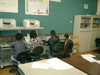 パソコンに向かう子。