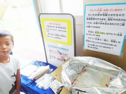 渡り廊下前には,『アルファ化米』の展示も置かれました。子どもたちは,