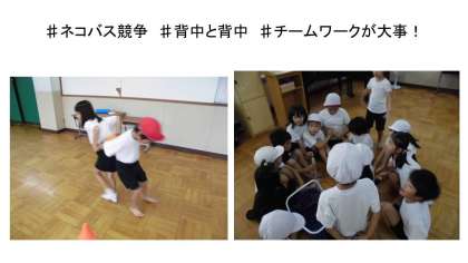 ネコバス競争で行う背中と背中でボールをはさんで走る練習をしました。本当は50m走でしたが,雨天のためプレイルームでネコバス競争の練習です。特に,ここの分野が苦手だったようなので,重点的に練習しました。
