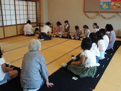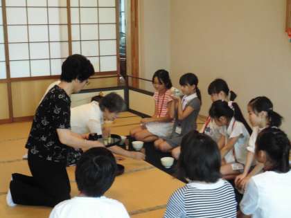 今日は,おじぎ(あいさつ)の仕方から,お茶のいただき方,たて方など,茶道の基本について教えていただきました。