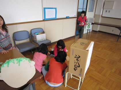 3年生は2月3日に,明日4日のキッズタウン福西2日目に向けて,お客さんからのアドバイスや感想をもとに1日目の振り返りを行い,2日目にどんなところを工夫しようかと話し合いました。その後,どの子も「1日目よりたくさんのお客さんが来てくれたらいいなぁ。」との思いで,プレイルームで明日に向けての準備を行いました。