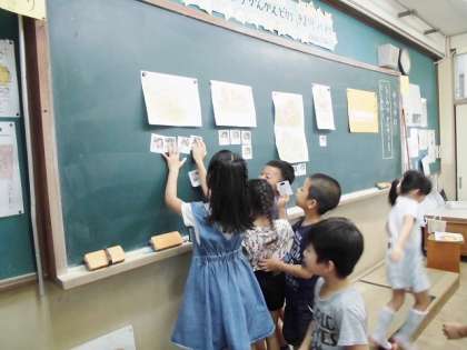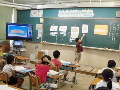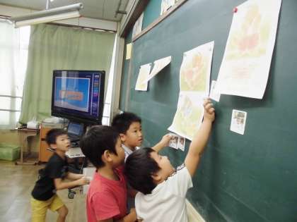 国語科『ゆうやけ』の学習では,お話の好きなところを読んだり,自分の体験と結びつける活動をしています。今回の学習では,全体をざっと通して読んでみて,四つの場面のうち,自分が一番好きだと感じた場面やその理由を簡単に話していきました。