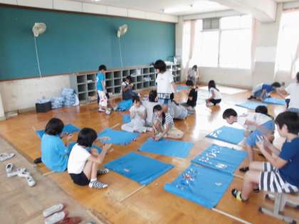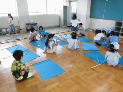 今日の5時間目には,運動会の演技で使うフラッグにかざりつけを行いました。自分の好きなもようや文字をキラキラのテープではりつけていきました。かざりつけをしたフラッグで演技をするとどのようになるのか今から楽しみです。