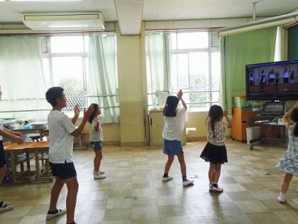 赤組・白組応援団の掛け声や,全校体操のダンスのビデオが各教室のパソコンから見られるようになっています。1年生の子どもたちは,休み時間などにビデオを見ながら練習するのが楽しみの1つになっています。