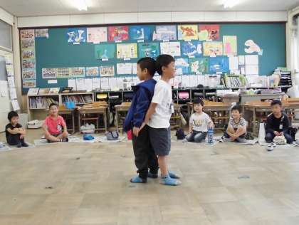 2組は床に新聞紙を敷いてピクニック風お弁当タイムにしました。日直さんが真ん中に立って,くるりと回りながら