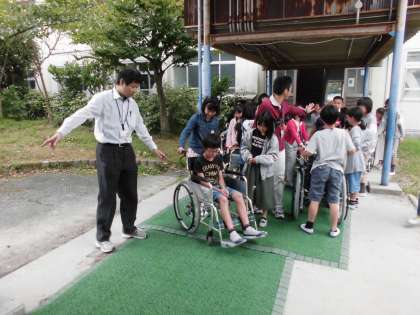 後半は,実際に車いすに乗って,校舎の周りを一周しました。普段は何でもなく通れる場所であっても,ほんの少しの段差でつまづいたり,スロープで傾いたりすると,こわさを感じることがわかりました。どの場合も相手の立場に立って手助けをすることが必要です。