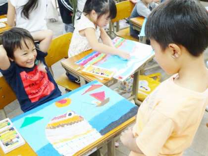 と,友だちに褒めてもらえて照れくさそうな笑顔を見せます。友だちの絵を見せてもらった子どもたちは,