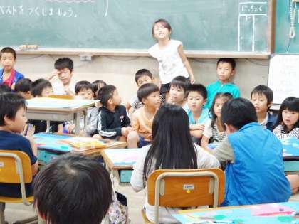 1年生はクラスごとに違うお話をテーマに絵を描いています。今日は,どのような絵を描いているのか少し交流をしました。自分のかいた絵を見てもらった子どもたちは,