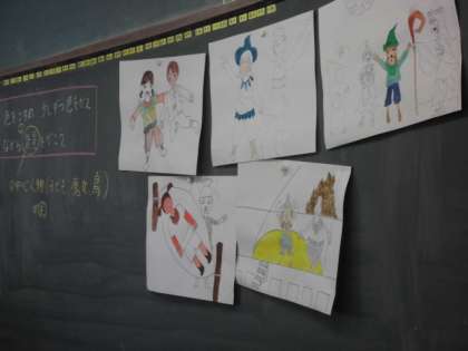 お話の絵の様子です。子どもたちの絵がとてもすてきだ。子どもたちが一生懸命取り組んでいる。なぜだろう。黒板を見ると…先生のモデルの絵が!!これが子どもたちの意欲に火をつけたのでしょう。いいモデルから学ぶ,すてきな姿でした。