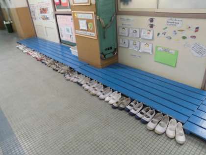 保健室の前を通りました。すると,あれれ?どこかで見た光景が・・・。とても美しく上靴が並んでいます。何年生が来ているのかな?と思い,そっと部屋をのぞくと・・・。室内では2年生が視力検査の真っ最中。検査している人以外,静かに座って待っています。素晴らしい!これがバルスなのでしょうか?
