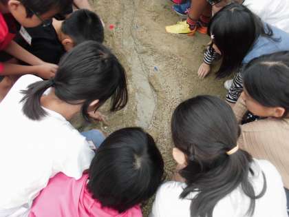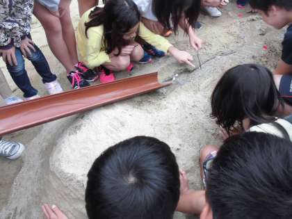 途中で流れが変わったり,深く土砂が掘り下げられたりする様子を,興味深げに観察する子どもたち。「自然界ではこれは…」とモデル実験と自然界を結び付けて考えた発言も…。思わず「イイネ!」を押してしまいたくなるそんな学習でした。