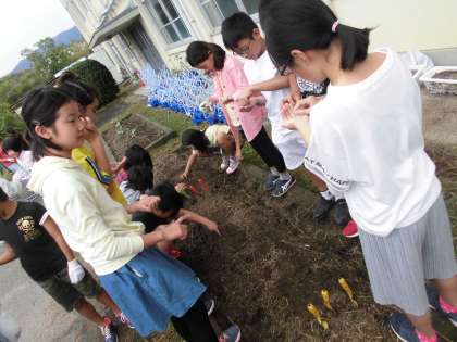 いよいよ学校園の種まきです。子どもたちが選んだイチゴととホウレンソウの種を,プランターと畑にまきました。