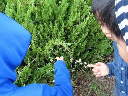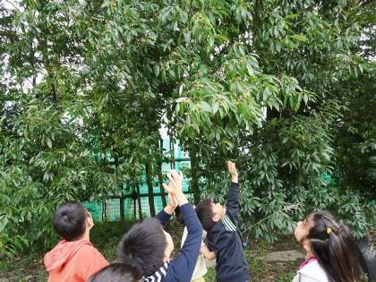 前回は草むらを探検し,秋探しをして子どもたち。今回は『もっと上の方に注目して探検しよう』というめあてで,校舎の南側に秋を探しに行きました。夏に花が咲いていたところには実がなっていたり,今までには気が付かなかったどんぐりの木を見つけたり……。注目する場所が違っていると,新しい発見がいっぱいありました。