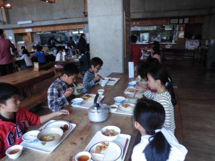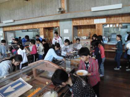 入所式の後、荷物をロッジに入れました。そして、ナイトハイクの下見をした後、昼食でした。鶏天どんぶりか塩ラーメンのどちらかを選んで、あとはバイキングで好きなものを好きなだけ食べました。中には、ちょっと欲張って、