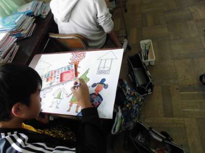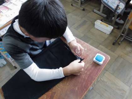 お話の絵を仕上げる人,完成している人はお弁当包み制作。