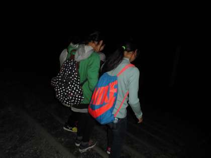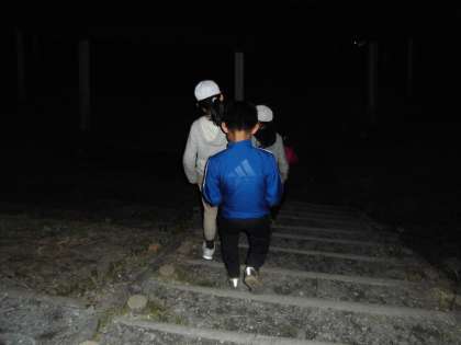 暗くなった山の中は、大人でもかなり怖いです。班で一つの「ペットボトルランタン」を持って出発です。中には、途中で火が消えてしまう班のありました。