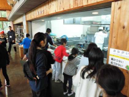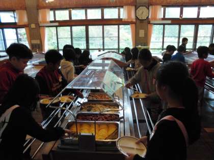 食堂でのバイキングも二度目なので、慣れてきました。まずは、みそ汁かコンソメスープを自分で選びました。その後は、メインにご飯を食べる人、パンを食べる人それぞれです。オムレツやウインナーも食べられるだけ取っていただきました。