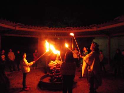 最終日のメインイベントは、なんといっても「キャンプファイヤー」です。花脊の山の神から「仲間の火」「挑戦の火」「信頼の火」「つながりの火」をもらって点火をしました。