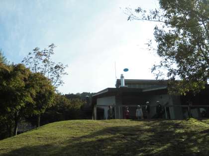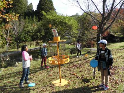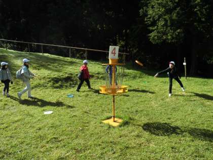 朝食の後、花背山の家の敷地内で「フライングディスクゴルフ」を楽しんでいます。班ごとにチームを編成して、全部で9ホールを回ります。今回は「花背コース」に挑戦しています。