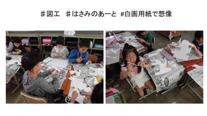 今日の図工は「はさみのあーと」です。はさみの約束や使い方を確認した後,いろいろな大きさの画用紙をいろいろな形に切りました。