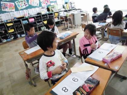 友だちとのペア学習も積極的に取り入れています。今回は,『9+□』の問題を,友だちと一緒に出し合って計算力を鍛えました。