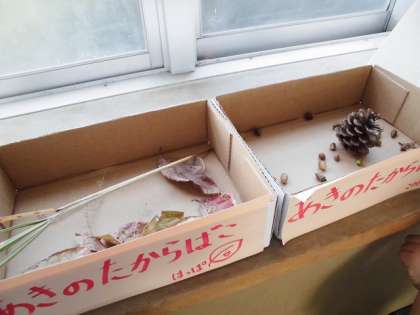 生活科『あきといっしょに』の秋遊びに向けての準備が着々とすすんでいます。教室前に設置した『秋の宝箱』の中身は,休み時間毎にどんどん増えていっています。葉っぱやどんぐり……注意して周りを見渡すと,いろいろな秋の宝物がいっぱいです。