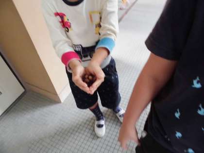 中には登校中に見つけたよ,といって松ぼっくりなどを拾って入れている子どももいました。学校の中だけではなく,町中に秋があふれているようです。