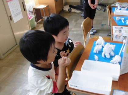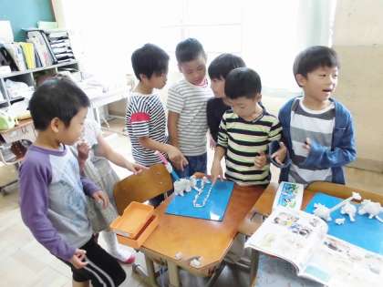 同じ形の生き物をたくさん作って『家族』や『きょうだい』というテーマでお散歩したり,持っている粘土すべて使って大迫力の作品を作ったりしました。それぞれがのびのびと作ったため,友だちの作品の鑑賞時間は大盛り上がり。ゴツゴツした造形から迫力を感じ取ったり,丸みのある形から愛らしさを感じたりしたことを発表し合いました。