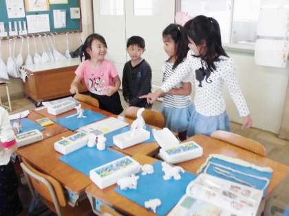 図画工作科で『いっしょにおさんぽ』を行いました。粘土を使って一緒にお散歩をしたい仲間の生き物を作るという学習です。前に学習した粘土の扱い方を復習しながら,いろいろな生き物を作っていきました。