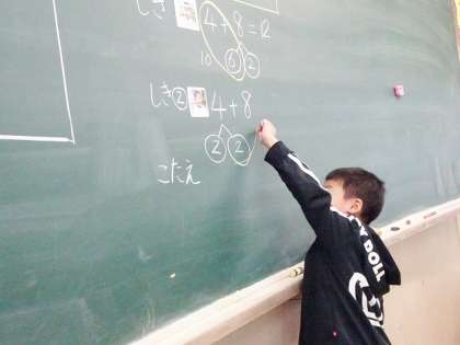 くり上がりのたし算に慣れてきた子どもたち。今日の『たしざん(2)』の学習では,「4+8」の式になる問題から,先にたす数字を分けて考える方法について学びました。