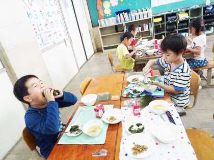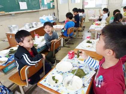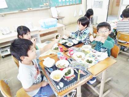 今日の給食は,納豆巻きです。手巻き寿司のように自分で海苔を巻いて食べます。上手にくるりと巻いて,美味しそうに頬張る子どもたちです。納豆は葱と味噌で,美味しい肉みそ納豆に調理されていて,納豆が苦手だという子もおいしく食べられたようです。