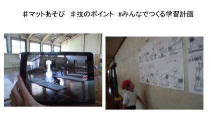 タブレットを使った技の見直しをしています。マットあそびをしている時は,自分がどのように手をついているのかや足はのびているかなど見えていないので,自分の技の姿をVTRで確認するようにしています。