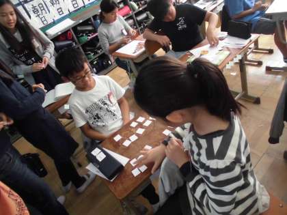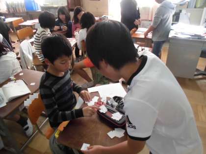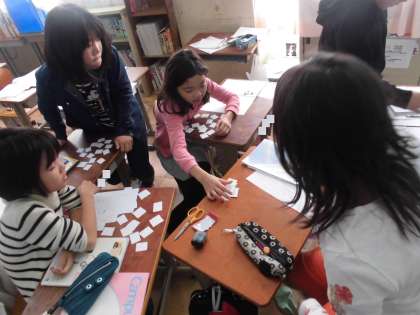 算数では分数の学習が始まりました。最初の時間は,分数カードを持って,友だちと大きさ比べです。「分母が一緒やから,勝った!」「あれ,これはどっちが大きいんや?」と友達と話をしながら進めていきます。数直線を見ながら,「えーっと,こっちがこうやから…。負けた〜!」と勝敗に一喜一憂の子どもたちでした。