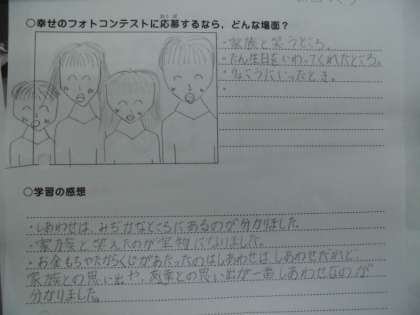 みなさんにとって幸せとはどんな瞬間ですか。今回の参観授業では,「幸せな瞬間(とき)フォトコンテスト」の映像をもとに,幸せはどんなところにあるのかを考えました。子ども達ははじめから分かっていたようですが,家族と暮らせること,入学したときのこと,生まれてきたこと,友達と出会えたことなど,幸せは身近なところにあることを確かめました。後半は自分がフォトコンテストに応募するならどんな場面かを想像し,書き記しました。泊まりに行って写真をとったときのこと,おじいちゃんの60歳のお祝いにおいしい料理を食べたこと,幸せだったことを思い出すこと,犬を選んで出会えたこと,みんなでサッカーをしていることなどいろいろなことを考えていました。