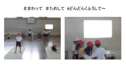 マットあそびのはずが,どんどんレベルアップしてきてマット運動へと変化してきました。振り返りでは,「先生,とび前転では飛び越えられるような目印がほしい。」「側転では,テープで手の位置を示せるようにしたい」など場づくりに関しておもしろい発想が。