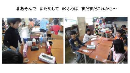 生活科「あそんでためしてくふうして」では,ガラクタカラバコから材料を選んで,どんな遊びができるか,考えています。この単元の出口では,1年生を招く「バルス屋台」を設定しています。