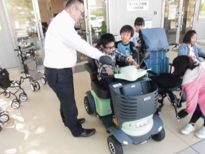 「三笑堂」では,体の不自由な方ができるだけ自分の力で生活ができるように手助けする用具や車について体験を通してお話を伺いました。子ども達は楽しく体験をさせて頂いきました。利用する人にとって笑顔でくらせるようになってほしいという願いが,「三笑堂」の名前の由来にもなっているのだな,福西の地域に根ざす必要なお店だと感じました。後半へ続きます。