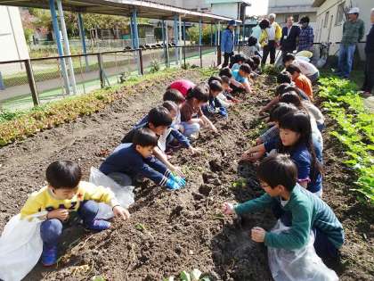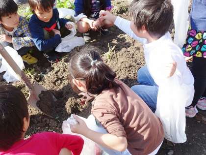 水曜日,初夏に植えたサツマイモを収穫しました。30センチほどだった苗も,今では子どもたちの背丈よりも長く伸びていました。土を掘りだしてみると,子どもたちの顔くらいのサイズのものから,指くらいの大きさの可愛らしいお芋まで,たくさん見つかりました。