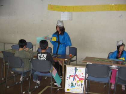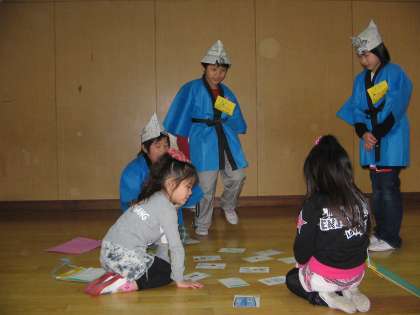 写真は,上から「いろいろけん玉」(1分間で15回入れると2ポイント,20回入れると3ポイントもらえます。みんな楽しくチャレンジしていました。),「ふれあいカルタ」(「め」いろ くるくる めいろこうえん,「キ」ッズタウン どれにいこうかまよっちゃう と自分たちで考えて作ったカルタで楽しんでもらっていました。)「福西クイズインジャパン」(福西のクイズに答えていくコーナーです。なかなか難しい問題もありました。)です。