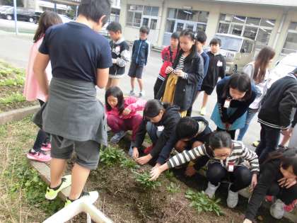 今日はホウレンソウの間引きを行いました。小さくかわいく育ったホウレンソウを抜くのは気が引けるようで,ちびりちびり…。「え〜っ,抜くの…。」と言いながら,がんばって間引きを行いました。優しい子どもたちです。でも,この作業がないとホウレンソウは大きく育ちません。さぁ,大きく育て,ホウレンソウ!