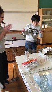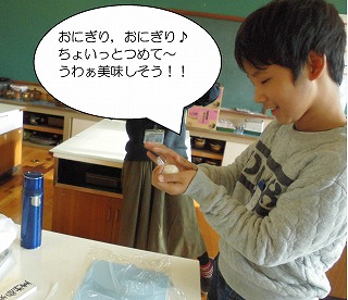お鍋の沸騰や中の様子を確認しながら,火加減を調節ができました。ふたをあけると美味しそうな匂いがしてきて,ふっくらとお米を炊くことができました。塩で味付けをして,お米をにぎりました。「お弁当ばこ」の歌が流れてくるくらい,1人で作った達成感があり嬉しくなりました。次回のメニューは・・・?? つづく