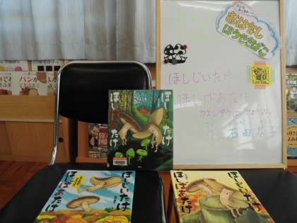 今回のお話宝石箱の方による本の読み聞かせは,「ほしじいたけ ほしばあたけ」シリーズの2冊目『ほしじいたけ ほしばあたけ〜カエンダケにごようじん〜』でした。おいしいキノコもあれば,気をつけなければいけないキノコもあります。いろいろなキノコがあることがわかりました。