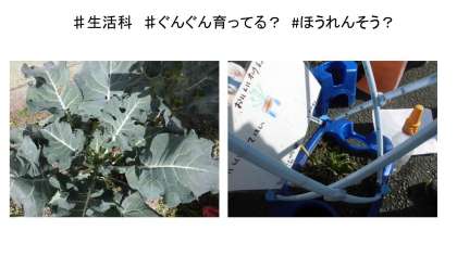 ぐんぐんそだての野菜の様子です。ぐんぐん育っているのはブロッコリー,ぐんぐん育たなくなっているのはほうれんそう。ピンチです。学年活動では,これらを使った調理を予定しています。お知らせも配布しますので,ぜひご参加ください。