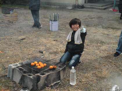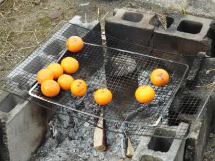 かまどの上にはおいしそうな焼きミカンが並んでいます。